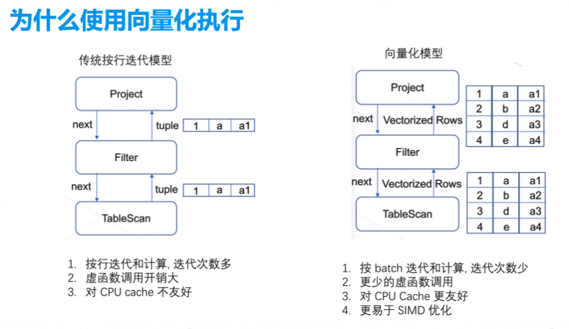 而从第二代的数据按行迭代到第三代向量化处理逻辑,产生了极大的优化。由于OceanBase 的用户场景除OLTP 类的简略查询外,还有报表剖析、业务决策等 OLAP 查询。而 OLAP 查询的数据处理量大、耗时高,传统的按行迭代模型每行都需要迭代一次,导致虚函数调用开销比较大,同时cache友好性也较差。为解决该问题, OceanBase 实现了向量化引擎。效果也很显著,在TPC-H 30T场景,向量化引擎的性能是非向量化的近3 倍,对于 Q1 这种聚合剖析且计算密集的 SQL 查询,性能提升约 10 倍。本次教程还会为你具体介绍更多OceanBase向量化实现细节。