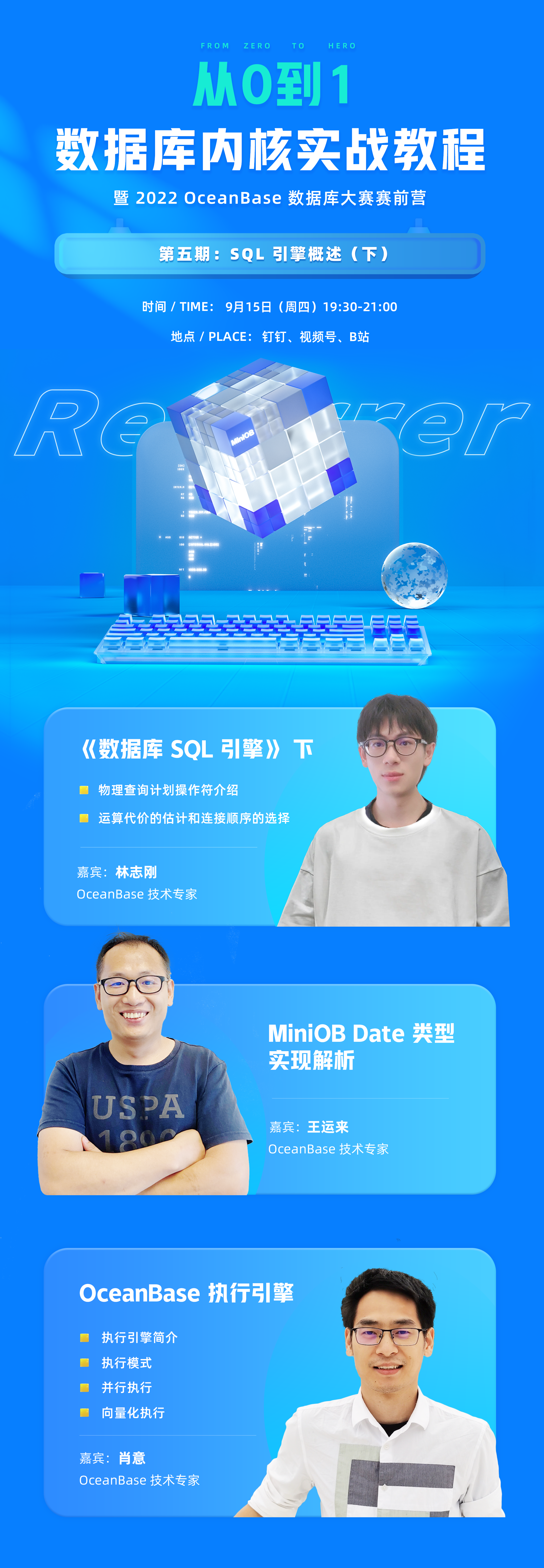 9月15日 19:30 内核实战教程第五期 将带你了解 SQL 执行引擎的基本理论知识及 OceanBase 的执行引擎实现,你可以深入了解一款企业级分布式数据库如何实现执行引擎的高性能及如何做到毫秒级地增删改查。通过本期** OceanBase 执行引擎实现过程**的学习,对于想参加 OceanBase 数据库大赛及想从事 SQL 层研发的同学都会有很大的帮助。
