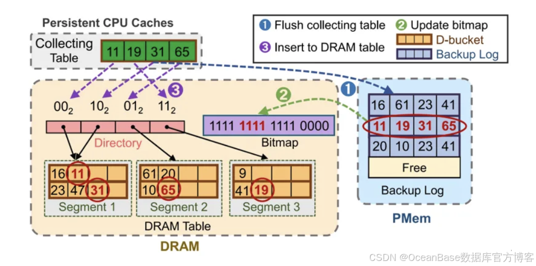 此技术旨在根治向 PMem 进行小粒度插入时引发的“写放大”(Write Amplification)与频繁桶探测问题。其方案是在持久性 CPU 缓存中预分配多个与 PMem 访问粒度对齐的“收集表”(Collecting Table)。新到达的键值对根据哈希值被直接路由到相应收集表,并通过原子操作实现无锁快速插入,从而充分利用缓存的高速与持久化特性。当一个收集表被填满时,其包含的多个键值对将作为一个完整的、与 PMem 最佳写入粒度匹配的数据单元,被一次性顺序刷写到 PMem 的备份日志中。这种方法彻底消除了因写入粒度不匹配带来的额外 I/O 流量,充分利用 PMem 的写入带宽,同时将零散插入转化为高效批量操作。