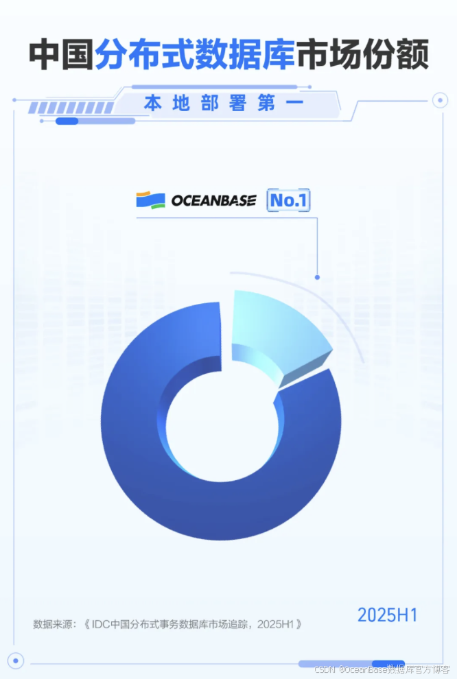 近日,全球权威机构 IDC 发布的《IDC中国分布式事务数据库市场追踪,2025H1》报告显示,2025 上半年,OceanBase 以 2810 万美元营收,稳居中国分布式事务数据库本地部署市场第一。这是继 2024 年下半年后,OceanBase 连续两次在该细分市场拔得头筹。