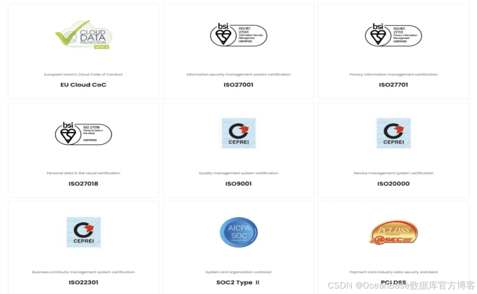 OB Cloud 已通过 ISO27001、PCI DSS、SOC2 Type II、EU Cloud CoC 等十余项行业权威合规认证,同时覆盖 ISO27018 隐私保护、ISO22301 业务连续性、ISO27017 云服务安全等专项合规标准。