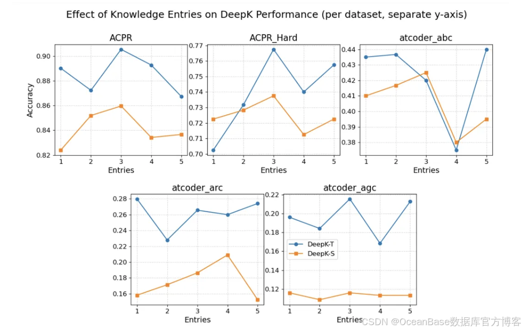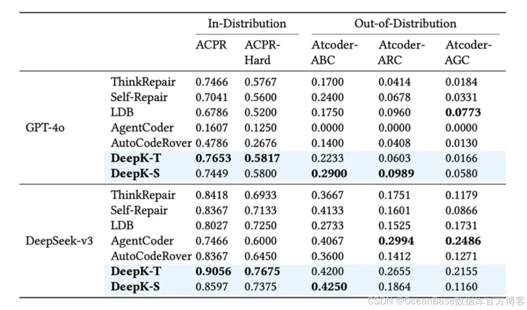 在 ACPR 与 AtCoder 等多个基准数据集上的实验结果表明,DeepK 在不同模型后端(GPT-4o与 DeepSeek-v3)下均能显著提升现有方法的修复准确率。在分布内场景中,DeepK 相较最强基线方法取得了稳定的绝对提升;在更具挑战性的分布外竞赛编程任务中,其相对提升尤为显著,显示出结构化调试知识在应对分布偏移时的独特价值。