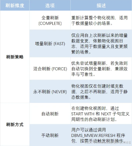 物化视图日志 (MLOG):这是实现增量刷新和实时物化视图的核心。当基表发生 DML 操作时,变更的增量信息会被同步记录到MLOG 中。刷新时,系统只需读取 MLOG 即可获取变更数据,避免了对整个基表的扫描。