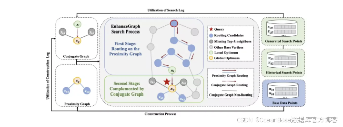 具体来说,在构建图索引时,首先将近似图中被裁掉的边(构造日志)添加到共轭图中。在历史查询中,将失败查询时收敛到的局部最优解,与离线计算或者用户反馈的全局最优解结合,构成搜索日志。基于搜索日志,可以在共轭图中添加缺失的从局部最优解到全局最优解的边。这些边将在搜索的第二阶段补充搜索结果,以提高召回率,确保历史中失败的查询不会再次收敛到局部最优。