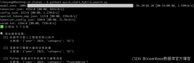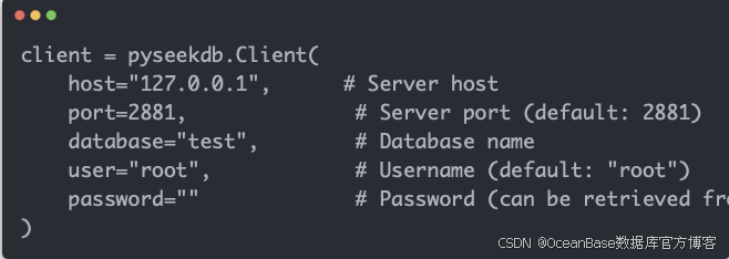 特别说明:seekdb 的嵌入式模式暂时只支持 Linux 服务器,如果是在 Mac 或者 Windows 本地测试,需要把 Python 代码里的client = pyseekdb.Client() 改成服务器模式的连接地址(推荐在 Mac 或者 Windows 上使用 seekdb 桌面版)。