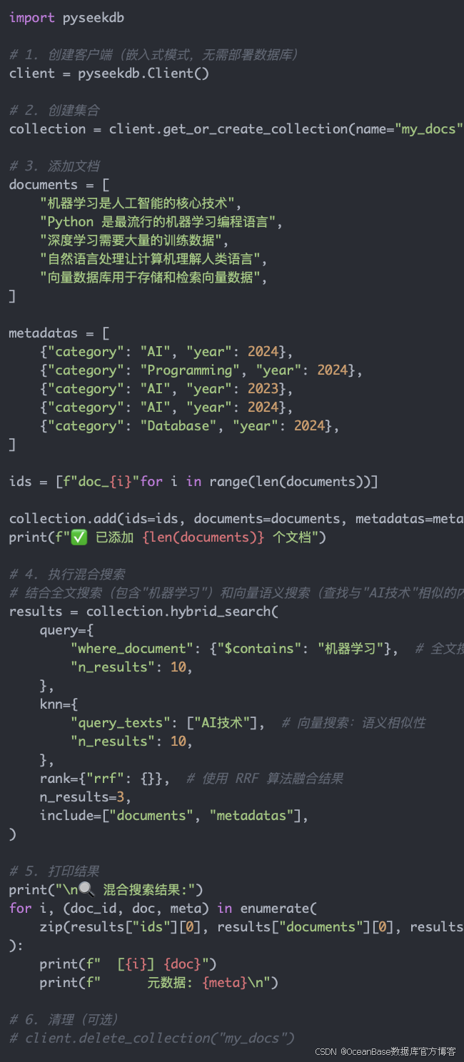 例如:我想用 Python 创建一个简单的 seekdb 应用,实现文档的混合搜索功能,请帮我写代码。